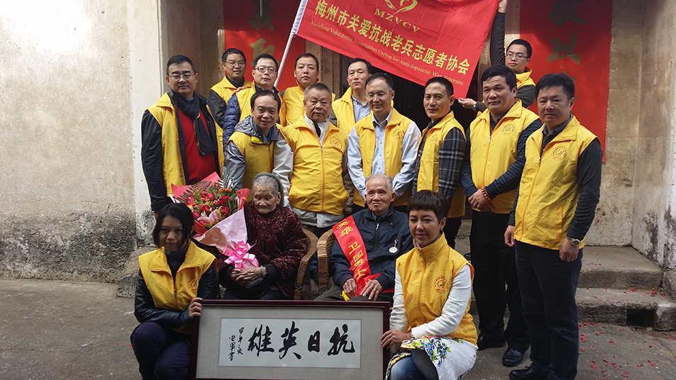 梅州市關(guān)愛抗戰(zhàn)老兵志愿者協(xié)會成立后,大力開展尋訪散居梅州山鄉(xiāng)的抗戰(zhàn)老兵,為尋訪到的每位抗戰(zhàn)老兵舉行民間簡樸又莊重的“贈章授榮”儀式、為困難老兵提供基本生活保障、為抗戰(zhàn)老兵提供日常生活照顧、為老兵過生日、重大節(jié)日慰問、生病看望看護(hù)、為抗戰(zhàn)老兵留影留聲、留手印,歸隊(duì)致以哀榮等等關(guān)愛活動,以熱心和誠心,為抗戰(zhàn)老兵送去“遲到的榮譽(yù)”和慰藉。經(jīng)協(xié)會理事會研究,決定對抗戰(zhàn)老兵進(jìn)行日常關(guān)愛的同時(shí),給幸存抗戰(zhàn)老兵每月500元的致敬金。通過發(fā)放關(guān)愛金和致敬金,使老兵每月能獲得1100元的生活保障。2014年9月至2018年5月,廣東省雁洋公益基金會發(fā)放葉劍英基金關(guān)愛金380多萬元,協(xié)會動員社會各界熱心人士和志愿者38600多人次,行程逾10萬公里,為抗戰(zhàn)老兵發(fā)放致敬金及其它慰問金等700多萬元,為抗戰(zhàn)老兵發(fā)放御寒物資一大批、保健品和日常生活用品、慰問品一大批,為住院就醫(yī)的抗戰(zhàn)老兵送上慰問金和輪值守護(hù)陪伴,累計(jì)為300多位梅州抗戰(zhàn)老兵及老兵遺孀,廣東以外800多位抗戰(zhàn)老兵及老兵遺孀送上了最真摯的關(guān)懷。